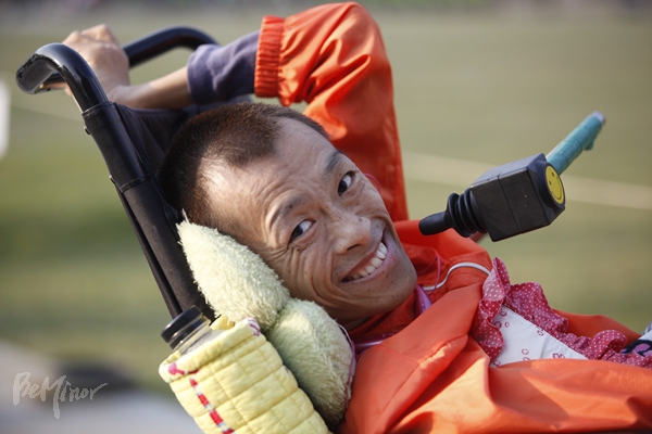 한 장애인이 불편한 몸으로 카메라를 응시합니다.