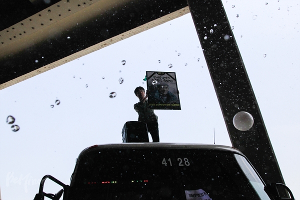 흐느끼는 장애인들의 주변에 경찰이 에워쌉니다. 장애인들이 버스를 타겠다고 나서는 것은 곧 현실을 마비시키는 것은 물론, 국가 제도에 정면 도전하는 것이기 때문입니다. 따라서 이날 폭력적으로 공권력을 동원해 이들을 가로막는 것은 허술한 국가가 선택할 수밖에 없는 당연한 일이기도 합니다. 고속버스승차권을 예매해 버스에 올라타려는 승객들을 겹겹이 가로막아선 경찰들은 최루액을 눈에 대고 쏘아댑니다. 버스 타겠다는데 집회시위와 관련된 법률을 어겼답니다.