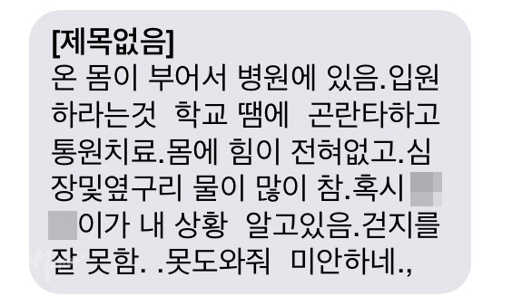 ![]() ▲4월 23일 쓰러져 사망한 쌍용차지부 정OO 조합원의 문자. 이갑호 창원지회장은 "형님은 벌이를 위해 입원은 엄두도 못 내고 통원치료를 해왔다"라며 "4월 30일 지회 주점 소식에 온몸이 부어 병원에 있으면서도 못 도와줘 미안하다고 마지막 문자를 보내기도 했다"며 고인의 죽음을 안타까워했다. [출처: 금속노동자] |
