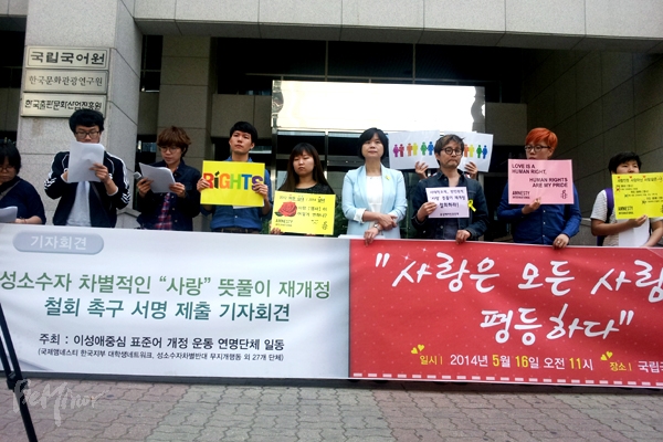 이성애 중심적인 '사랑' 뜻풀이에 반대하는 서명 참가자가 한 달여 만에 5676명(15일 기준)에 달한 가운데, 성소수자 인권단체들이 기자회견을 열고 서명 명부를 국립국어원에 전달했다.