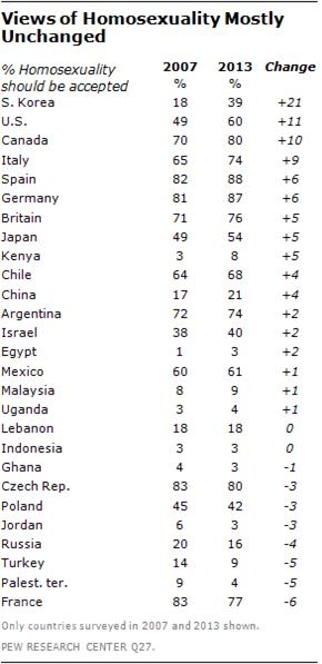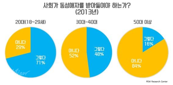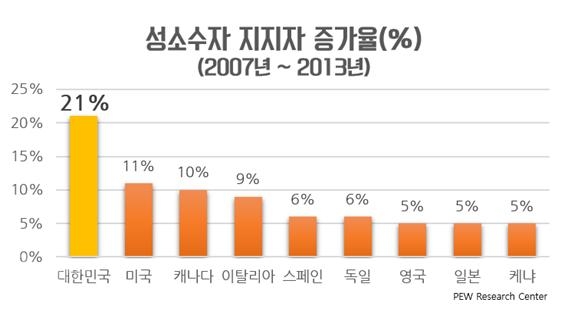 국제 여론조사 연구기관인 '퓨 리서치 센터(Pew Research Center)'에서 조사해 발표한 보고서 '동성애에 대한 국제적 인식차(The Global Divide on Homosexuality)'에 따르면, 2007년부터 2013년까지 6년 동안 "사회가 동성애를 받아들여야 한다"라고 대답한 비율이 전 세계에서 가장 빠르게 증가한 나라는 바로 대한민국이라고 한다.