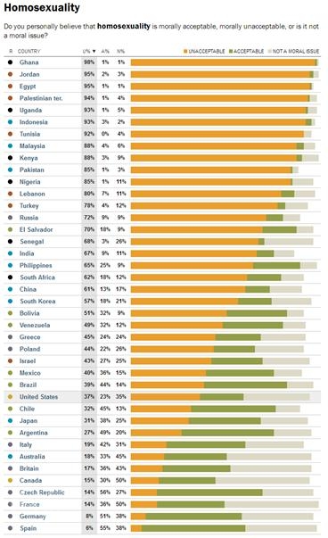 자세히 살펴보면, 퓨 리서치 센터의 2013년 조사를 기준으로 동성애에 대한 사회의 포용도가 가장 큰 나라는 스페인(88%)이며, 독일(87%), 체코(80%), 캐나다(80%) 등 서양의 많은 나라가 과반수가 넘는 동성애 포용도를 보인다. 남미의 여러 나라들은 40%~70%의 값을 보이며, 최근 결혼 평등 등 성소수자 이슈가 크게 회자되었던 미국은 60%의 값을 보였다.