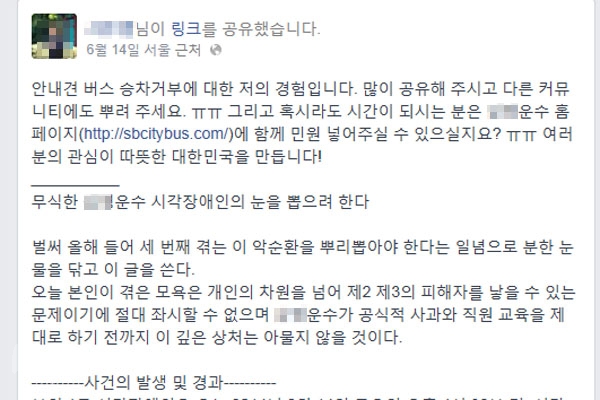![]() ▲1급 시각장애인인 ㄱ씨는 자신이 겪은 버스 승차 거부 사건을 자신의 페이스북을 통해 공개했다. |