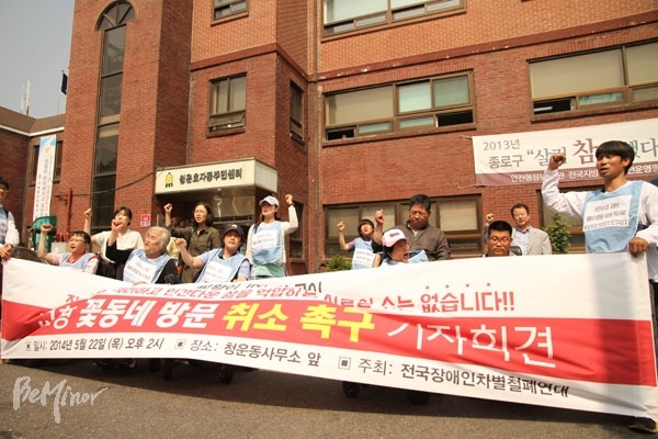지난 5월 22일 전국장애인차별철폐연대(아래 전장연)는 교황의 꽃동네 방문 취소를 요청하는 기자회견을 연 뒤 꽃동네 방문 취소 요청서를 주한 교황청대사관에 전달했다.