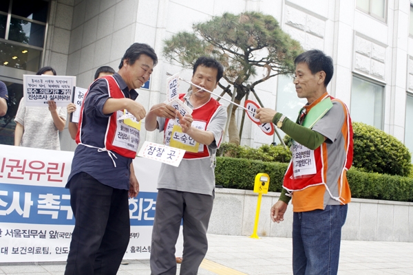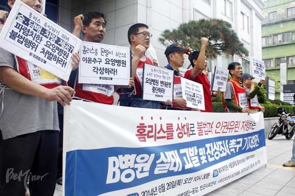 홈리스행동·건강세상네트워크·인도주의실천의사협의회 등 인권단체들은 26일 이른 10시 30분 서울 충정로에 있는 복지부장관 서울집무실 앞에서 'B병원 실태 고발 및 진상조사 촉구 기자회견'을 열고 그동안 B요양병원이 노숙인 등을 상대로 자행한 각종 불법행위들을 폭로했다.