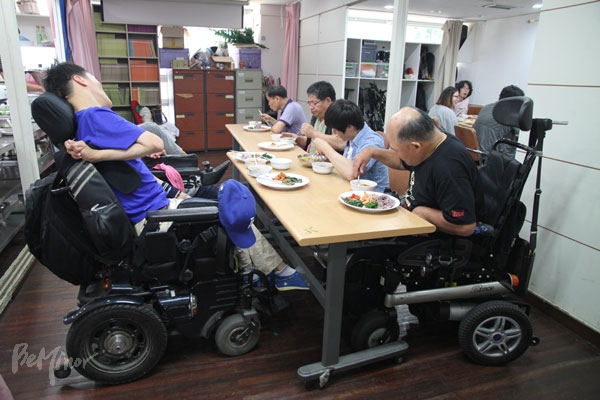 ![]() ▲수업이 있는 저녁, 노들야학에서 학생들과 활동보조, 교사들이 함께 식사하고 있다. |