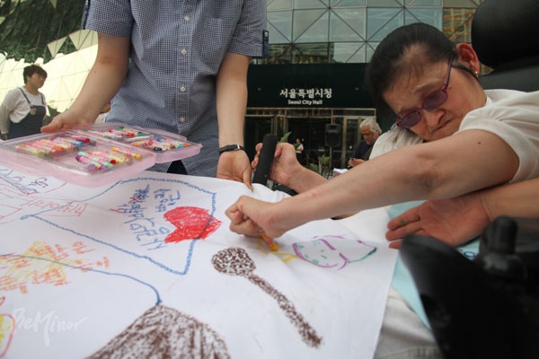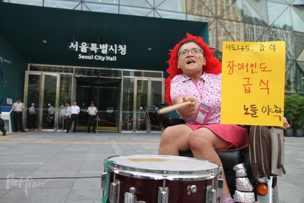 ![]() ▲노들장애인야학이 무상급식을 요구하며 26일 서울시청 앞에서 현장수업과 함께 ‘밥 콘서트’를 열었다. 이들은 무상급식이 실현되는 날까지 매주 목요일 서울시청 앞에서 현장수업을 진행할 예정이다. |