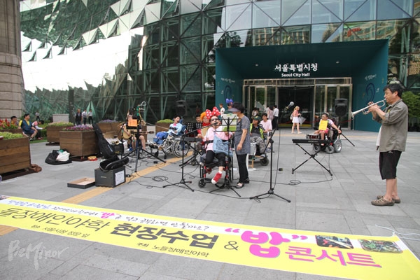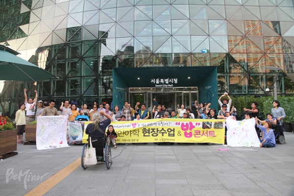 노들야학 학생 20여 명과 교사 10여 명은 26일 늦은 5시 서울시청 앞에서 현장수업과 함께 ‘밥 콘서트’를 열었다. 이들은 “밥 먹고 싶다”라며 “노들에도 친환경 무상급식을 제공해달라” 외쳤다. 현장수업에선 중증장애인 학생들로 이뤄진 노들음악대가 연주하고, 곧이어 미술반 학생들이 천에 크레파스로 자신에게 갖는 밥의 의미를 그림으로 그렸다.