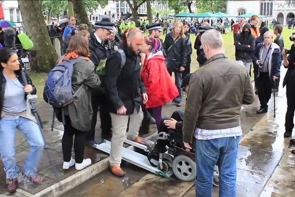 DPAC가 누리집을 통해 공개한 영상을 보면, 영국 경찰은 휠체어를 탄 장애인이 턱을 넘어 이동하기 위해 설치한 경사로를 두 발로 가로막아 진입하지 못하게 막는 행동을 보이기도 했다. 이러한 경찰의 행동에 시위자들은 “창피한 줄 알아라”(“Shame on you”)라고 외치기도 했으며, 일부 장애인들은 쇠사슬로 사원을 둘러싼 울타리에 휠체어를 묶으며 강하게 저항했다.