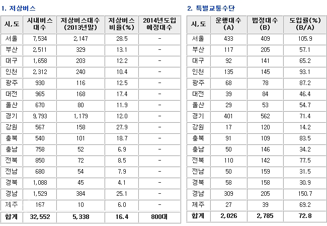 먼저 2013년 말 기준 전국 저상버스 비율은 16.4%로 100대 중 16대만 저상버스다. 그나마도 서울, 경남, 강원 등이 20% 후반대여서 전국 평균이 높을 뿐 10%도 채 되지 않는 지역이 수두룩하다.