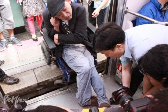 ![]() ▲'장애인도 고속버스를 타고 싶다'라며 티켓을 구매해 탑승하려 했지만, 휠체어리프트도 장착되지 않았고 좁은 내부 구조 등으로 결국 중증장애인들은 탑승하지 못했다. |