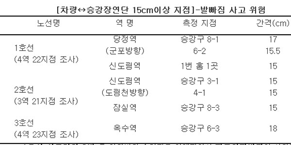 ![]() ▲지하철 차량과 승강장 연단 간격이 15cm 이상인 지하철 승강장 ⓒ한국소비자원 |