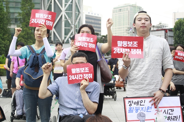 이날 결의대회 참가자들은 활동지원 사각지대 피해를 막고자 활동보조 24시간 쟁취 투쟁에 나설 것을 결의했다.