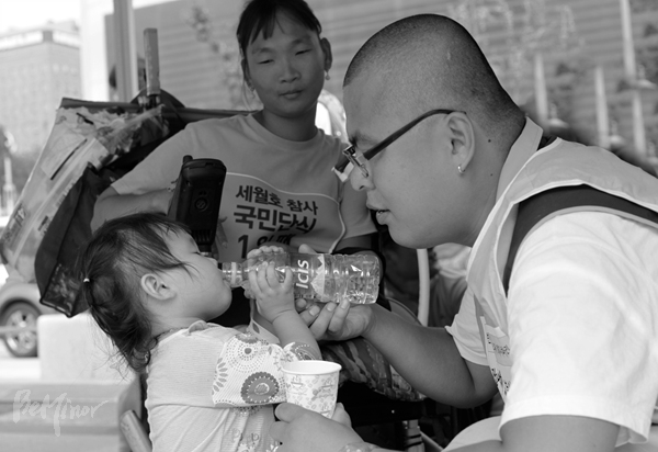 물을 마시는 아이를 바라보는 어미는 세월호 참사 동조 단식 중입니다. 눈에 넣어도 아프지 않을 금쪽같은 아이입니다. 이제 우리는 어떻게 아이들을 키워내야 할까요? 그 작은 실천은 세월호 특별법을 올바르게 제정하는 것에서부터 출발해야 할 것입니다. 뜨거운 햇볕이 내리쬐는 광화문광장의 풍경이었습니다.