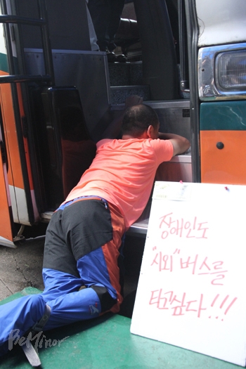 그러나 이날 장애인들은 휠체어 리프트 등 장애인이 탑승할 수 있는 설비가 갖춰지지 않아 버스에 탈 수 없었다. 한 장애인 활동가가 휠체어에서 내린 뒤 버스에 기어 올라가고 있다.