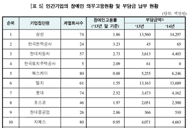 자료에 의하면 30대 기업 중 장애인 의무고용률(2013년 기준 공기업 3.0%, 민간기업 2.5%)를 준수한 곳은 공기업 3곳, 민간기업 4곳이었다.