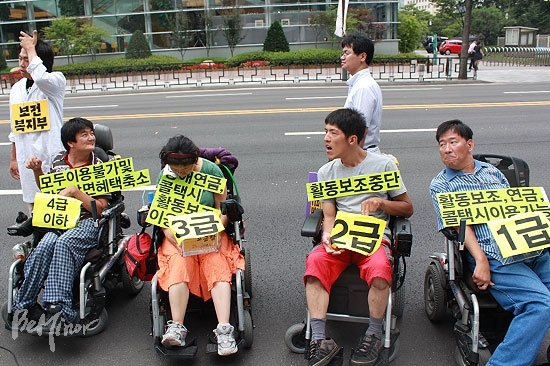 그런데 웬걸. 중증장애인들이 지역사회에서 살아가기 위해 필수적인 활동보조인서비스를 신청하려니 복지부에서 장애등급을 재심사 받아야 한다고 한다. 걱정이 돼서 미리 아는 의사를 통해 장애등급을 매기는 기준에 대해 물어보았더니, 1급에서 2급으로 떨어질 수 있다 한다. 장애등급이 1급에서 2급으로 떨어지는 순간 그는 활동보조인서비스를 신청조차 할 수 없게 된다. 그러면 혼자서 살아가기가 거의 불가능하다.