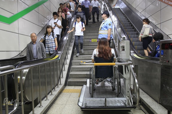 사진은 ‘동대문역사문화공원역’ 안의 모습입니다. 수많은 사람의 시선을 받으며 한 장애인이 리프트를 이용하고 있습니다. 아직도 이 나라는 장애인이 자유롭게 이동하는 데 불편을 초래하는 환경적 요소가 많은 것 같습니다. 공공의 지하철역을 짓는데 설계부터 이를 고려하지 않고 추진했기 때문입니다. 한 치 앞을 내다보지 못한 행정의 이면을 보는 듯합니다.