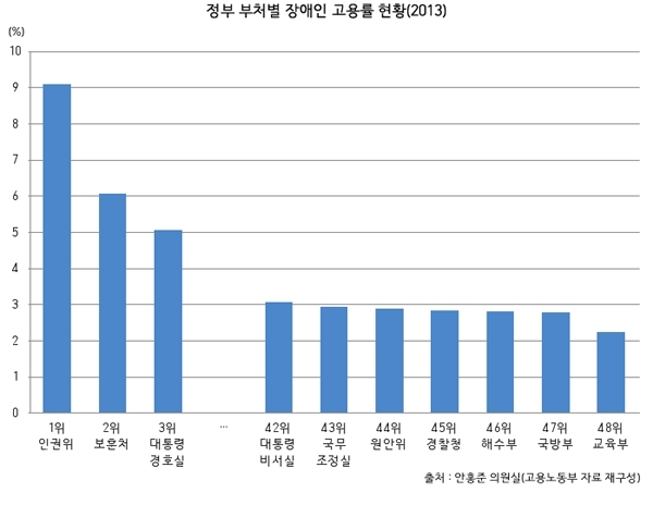 새누리당 안홍준 의원(교육문화체육관광위원회)이 고용노동부로부터 받은 ‘정부 부처별 장애인 고용률 현황(2013)’에 의하면 정부 48개 부처 중 42개 부처가 장애인 의무고용률을 준수했으나, 경찰청, 국방부, 교육부 등 6개 부처는 의무고용률을 지키지 못했다.