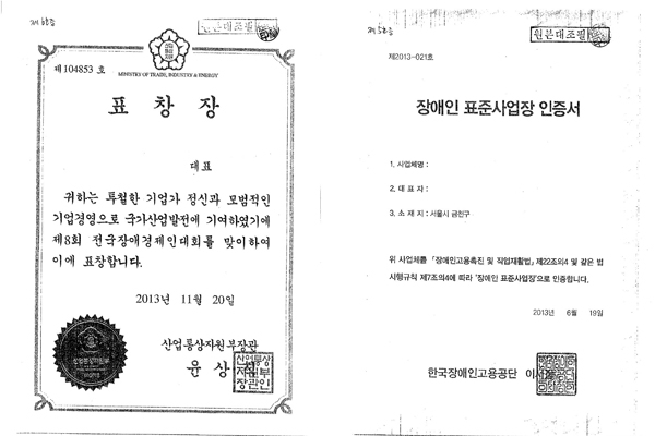 전체 38명 중 35명의 장애인이 일하는 J사는 노동부와 한국장애인고용공단에서 지정한 장애인표준사업장이자 2013년 5월부터는 장애인우수사업주로 인증된 곳이다. 또, 2013년 11월에는 산업통상자원부 장관으로부터 모범 기업경영으로 표창장까지 받은 곳이다.