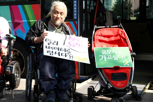 이날 행사에는 광화문역 엘리베이터 설치 시민모임도 참여했다. 이들은 '타요' 저상버스 앞에서 장애인과 유모차의 이동권을 보장하라는 선전전을 진행했다.
