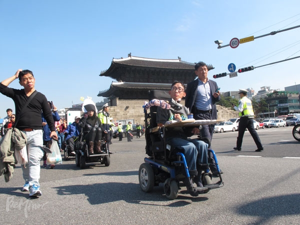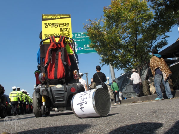 ![]() ▲10월 17일 유엔이 정한 세계 빈곤철폐의 날을 맞아 장애인, 철거민, 노점상, 노숙인, 에이즈 감염인 등 이 땅의 빈민들이 “가난한 이들의 죽음을 멈추자”라고 외치며 거리로 나섰다. 퍼레이드에 참가한 한 장애인이 박근혜 정부의 ‘깡통복지’를 꼬집으며 전동휠체어에 ‘깡통복지’를 차고 행진하고 있다. |