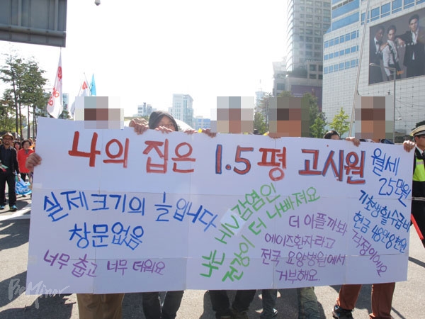 ![]() ▲“나의 집은 1.5평 고시원” HIV/AIDS 감염인들이 자신이 머무는 고시원의 실제 크기 1/2에 해당하는 피켓을 들고 행진하고 있다 |