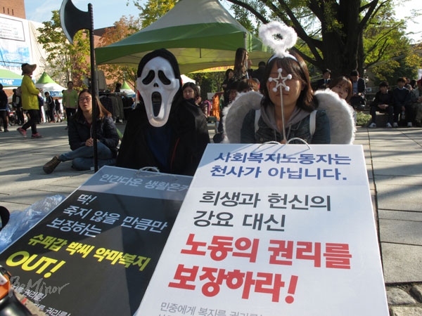 ![]() ▲사회복지노동자들이 노동의 권리는 보장하지 않고 희생과 헌신을 강요하는 노동 복지 현실을 규탄하는 분장과 피켓을 들고 있다. |