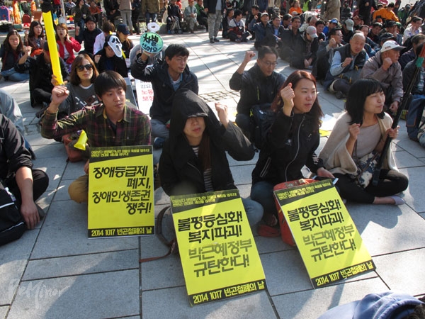 또한 1017 조직위는 정부의 가난한 이에 대한 탄압이 도를 넘고 있다고 성토했다. 1017 조직위는 “박근혜 대통령은 당선 직후 구걸행위를 금지하더니 부정수급을 근절하겠다며 기초생활수급자, 복지수급자들을 예비범죄자화 했다”라며 “거리 노숙인을 유인, 감금하고 의료수가를 챙겨온 병원에겐 그 죄를 묻지 못한다. 거리 미화, 불법을 들먹이며 노점상을 폭력적으로 단속하는 한편 잘못된 개발정책으로 인한 철거민들의 문제 해결에는 무책임하다”라고 꼬집었다.