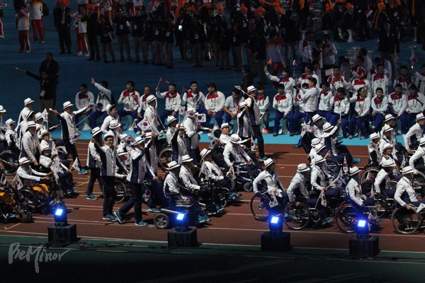선수단은 1장과 2장 공연 사이에 입장했다. 가나다 순으로 네팔 선수단이 가장 먼저 입장했으며, 마지막에는 개최국인 한국 선수단이 입장했다. 사상 최초로 장애인아시아경기대회에 출전한 북한 선수단, 전쟁 중에도 대회에 참가한 팔레스타인 선수단 등은 큰 박수 갈채를 받으며 입장했다.