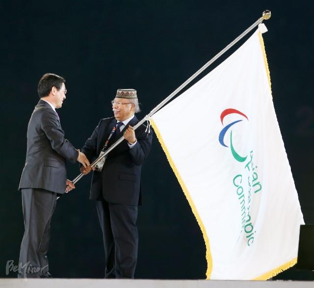 ![]() ▲한국과 자카르타가 장애인아시아경기대회 깃발을 주고 받는 모습 (사진=2014인천장애인아시아경기대회조직위원회 제공) |