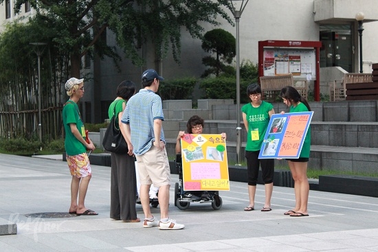 ![]() ▲2010년 장애민중연대현장활동단은 11일 고려대 안암캠퍼스에서 장애인편의시설 실태를 조사하고 시정을 요구하는 '스쿨어택' 행사를 진행했다. |