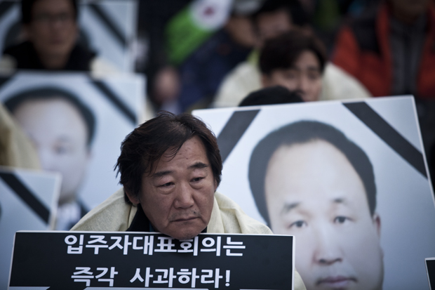 ![]() ▲ 지난 7일 사망한 압구정 신현대아파트 경비노동자 이만수 열사의 영정을 들고 참가한 노동자 ⓒ참세상 |
