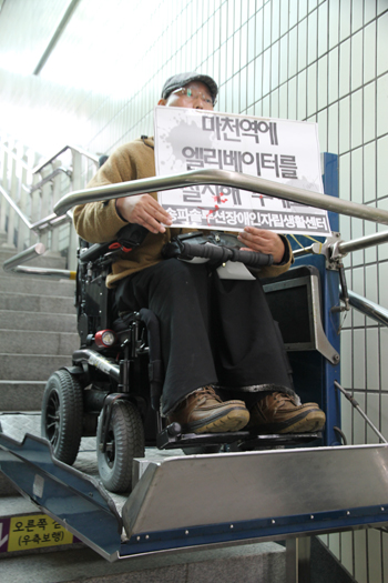 서울도시철도공사가 관리하고 있는 5호선 마천역은 지하 2층 대기실에서 지상까지 리프트만 있을 뿐, 엘리베이터가 없다. 비장애 성인이 대기실에서 지상까지 올라가는 시간은 5분 남짓. 그러나 휠체어 이용 장애인이 리프트를 이용하면 순수하게 타는 시간만 10~15분, 대기 시간까지 고려하면 최대 30분까지 소요된다.