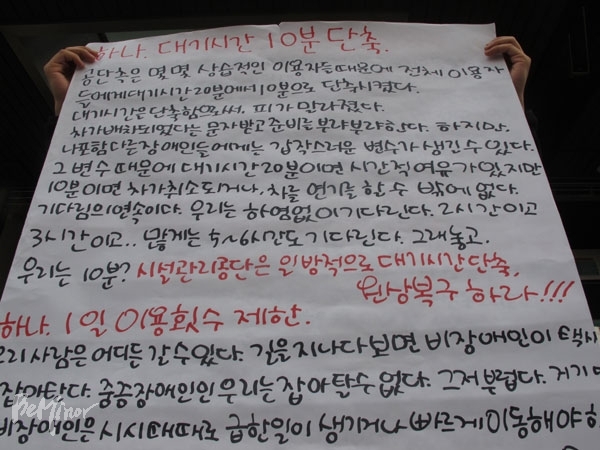 그러면 왜 나를 포함한 장콜 이용자들이 제시간에 접수를 안 하고 1시간씩 앞당겨 접수하는지, 그 이유를 알고 있는가? 약속시각을 지키기 위해서다. 병원 진료시간, 학교 수업시간, 모임의 약속시각 등 약속한 시간을 지키는 일이 장애인들에겐 왜 그렇게나 힘든 일인가? 사전접수제는 그나마 자신이 탑승해 약속시각에 도착할 시간을 예측할 수 있다. 이를테면, 2시에 광화문에서 친구를 만나기로 했고 그 시간을 지키려면 장콜을 보통 1시간 전에 부른다. 그런데 장콜이 하도 잘 연결되지 않다 보니 30분이고 1시간이고 미리 부르는 것이다. 특히 오후 5시대부터는 거의 제시간에 연결되지 않는다.