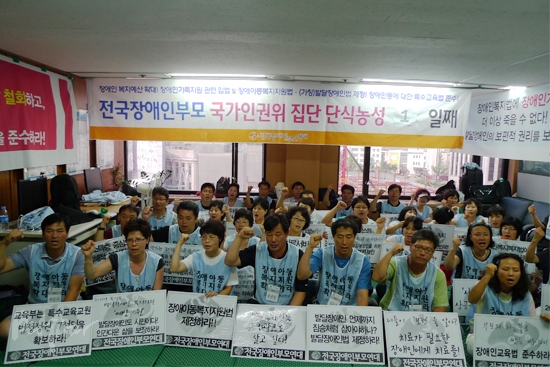 장애인복지예산확대를 위한 전국장애인부모 국가인권위 집단단식농성 1일째. 전날 국가인권위 점거농성에 들어간 전국장애인부모연대(아래 부모연대)는 18일 이른 11시 기자회견을 열고 장애아동과 발달장애성인을 위한 복지 확대를 촉구했다. 전국에서 모인 장애인부모 43인의 집단 단식투쟁도 이날부터 시작됐다.