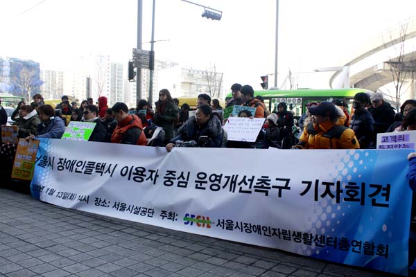 ![]() ▲서울시장애인자립생활센터총연합회는 서울시설관리공단의 일방적인 장애인콜택시 운영개선안에 반발하고 나섰다. |