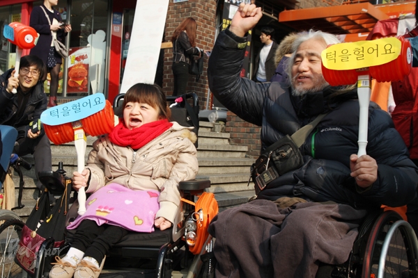 이에 노들장애인야학 학생들과 ‘민중과 함께하는 한의계 진료모임 길벗’(아래 길벗) 회원 40여 명은 24일 이 구간에 경사로, 편의시설을 설치하라고 촉구하며 ‘대학로, 턱을 없애고 경사놨네’ 행사를 열었다.