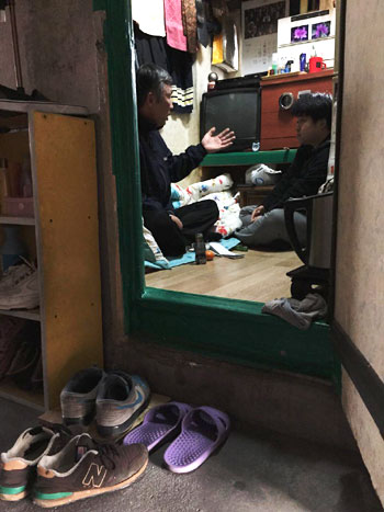 ![]() ▲쪽방 안에서 동자동 사랑방 조승화 사무국장(오른쪽)이 한 거주민과 이야기하고 있다. |