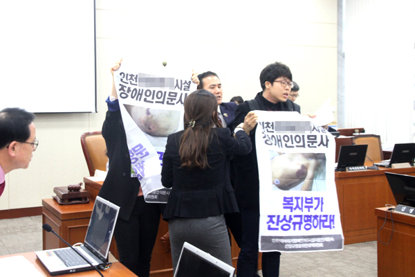 장애인거주시설 거주인이 온몸에 피멍투성이로 병원에 입원해 35일만에 사망한 사건에 대한 보건복지부 차원의 진상조사가 이뤼지지 않고 있는 가운데, 장애인 인권 활동가들이 24일 오후 3시 50분 경 국회 보건복지위원회 회의장에 기습적으로 진입해 진상조사를 촉구하는 시위를 벌였다.