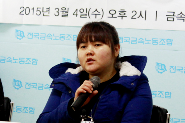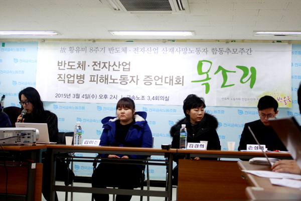 4일 금속노조 회의실에서 열린 ‘반도체·전자산업 직업병 피해노동자 증언대회’에서 마이크를 잡은 김미선 씨(35)는 갈수록 나빠지는 자신의 몸상태를 설명하기 힘들어했다. 그녀는 이제 케인(시각장애인용 지팡이)을 써야 하는 상황이다.