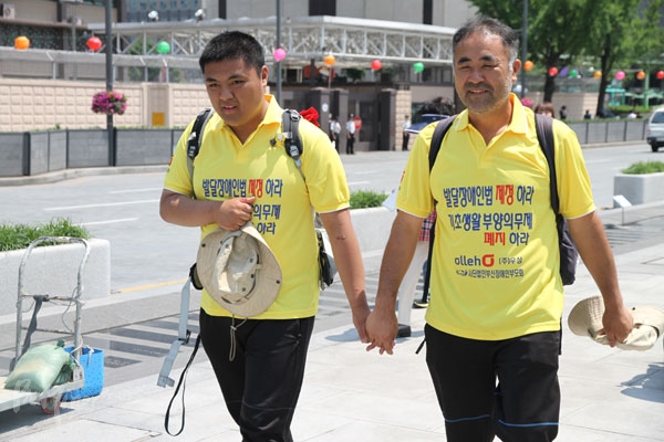 그 길로 2011년 부산에서 서울까지 600km, 부산에서 광주까지 600km, 이듬해에는 광주에서 서울까지 500km, 부산에서 강원도를 거쳐 서울까지 800km. 그리고 2013년 5월엔 제주 올레길 500km를 걷는다. 지나온 발자국을 되돌아보니 3000km다. 길을 걸으며 균도 부자는 그들처럼 고통 겪고 있던 장애인 부모들을 만났고 한진, 쌍용, 재능 해고노동자 등과도 만나며 아픔을 나누고 연대할 수 있었다. 그 힘을 받아 2014년엔 태국, 올해엔 일본까지, 한반도를 누비며 걷던 걸음이 세계를 향했다.