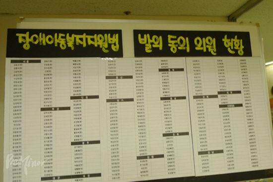 ![]() ▲농성장 한 쪽 편에 마련된 장애아동복지지원법 발의 동의 의원 현황. |