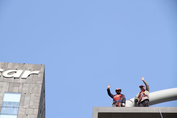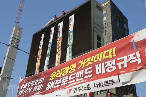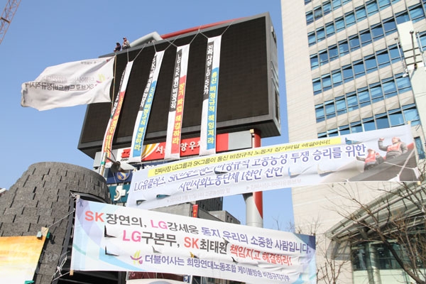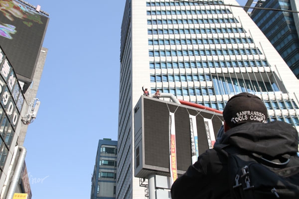대회를 마친 420공투단은 생존권과 노동권 보장을 위해 서울 중구 명동의 광고판에서 고공농성 중인 SK브로드밴드, LGU+ 하도급업체 노동자들을 찾아 연대 집회를 했다. 현재 SK브로드밴드 장연의, LG유플러스 강세웅 씨가 49일째 고공농성 중이다.