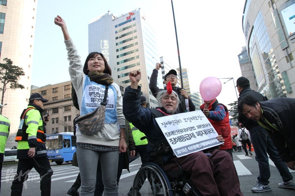 행진하던 중 420공투단이 "장애인 차별을 철폐하라!"고 외치고 있다.