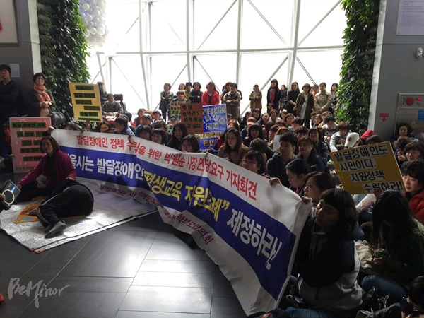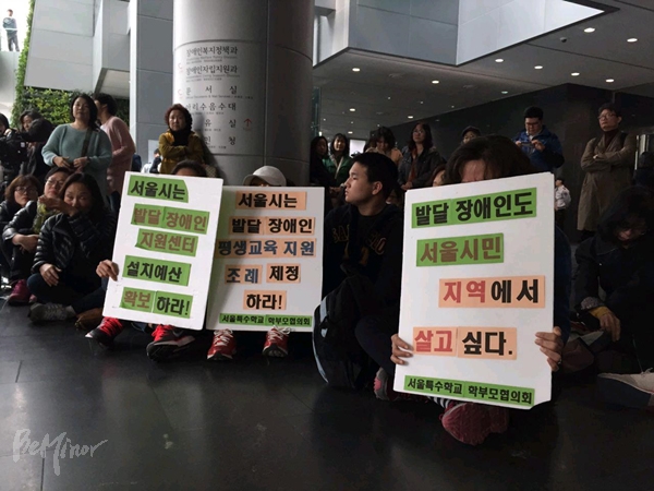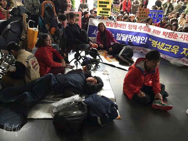 성인이 된 발달장애인에 대한 평생교육 및 자립지원 대책을 요구하며 장애인부모 단체들이 9일 오전 11시 30분께부터 서울시민청 1층에서 점거농성을 벌이고 있다.