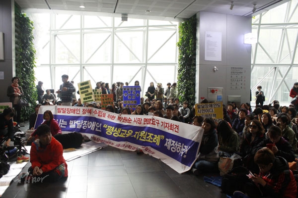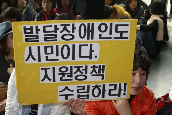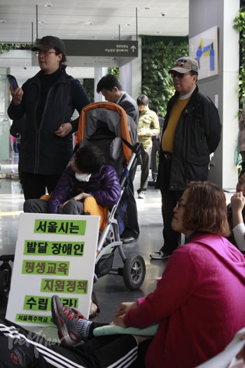 ![]() ▲휠체어를 탄 발달장애인 앞에 피켓이 세워져 있다. "서울시는 발달장애인평생교육 지원 정책을 수립하라" |