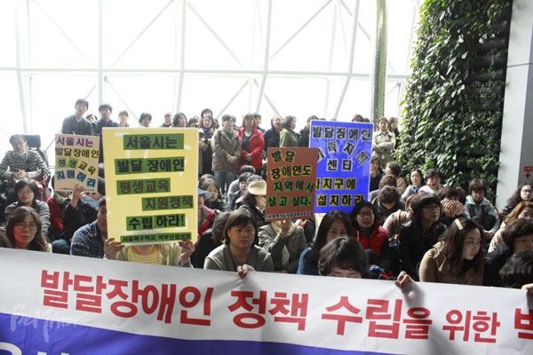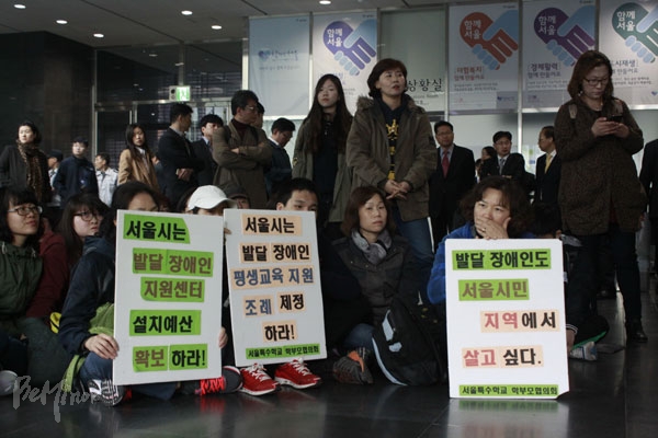 지난해 발달장애인법이 통과되고 올해 시행을 앞두고 있다. 이들은 이 법에 근거하여 요구하고 있다. 서울시 권역별로 발달장애성인을 위한 평생교육센터와 장애인가족지원센터를 설치해 운영 예산을 확보할 것, 발달장애인지원센터를 설치하고 운영에 필요한 예산을 확보할 것.