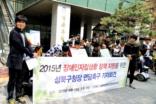 성북네트워크는 15일 오후 2시 성북구청 앞에서 기자회견을 열고, 장애인 자립생활 보장을 위한 7대 요구안을 제시했다. 7대 요구안은 △활동보조인 생활임금 보장 △장애인자립생활센터 및 보장구 수리 지원 예산 확대 △활동지원서비스 24시간 확대 △자립생활 체험홈의 지원 확대 △장애인 평생교육 지원 △중증장애인 생활체육 지원 재정 확보 △성북구 장애인인권센터 설치 및 예산지원 등이다.