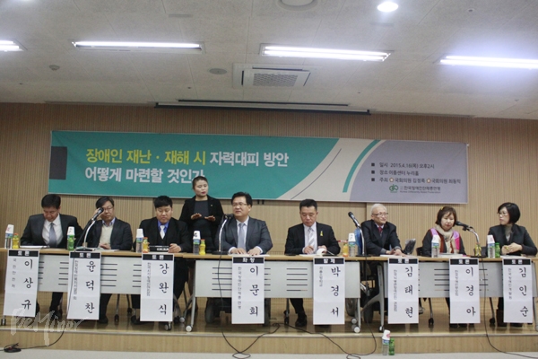이에 한국장애인단체총연맹, 새누리당 김정록 의원실, 새정치민주연합 최동익 의원실은 16일 재난 시 장애인의 대피 방안에 대해 논의하는 토론회를 열었다.